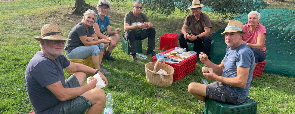 Beim Tischfussball, also dem Töggelen, sagt man dem entscheidenden Ball "s'Närvebälleli". Das "Närvebälleli" der Ernte war der darauffolgende Mittwoch. Trocknen die Bäume ab oder nicht? Hält das Wetter oder nicht? Sollen wir vorzeitig den Weg zur Ölmühle antreten oder nicht? Wir fingen an und hetzten durch das Feld wie die Wildschweine bei der gegenwärtigen Jagd. Es hellt auf, nein, doch wieder dunkle Wolken, Regenschauer am Horizont, dann wieder blauer Himmel und erneut bedrohliche Wolken von Westen her. Kam der Tropfen nun vom Himmel oder von der eigenen Stirn? Weiter, hüü, wer weiss, jeden Moment kann der Regen kommen. Verpflegen? Ok, aber nur eine 20 minütige Pause auf dem Feld. Wir gaben alles, der Regen kam nicht und wir beendeten die Arbeit kurz nach 17.00 Uhr. Alle figufertig. An diesem Tag ernteten wir 942 kg Oliven, also fast eine Tonne! Und das, obwohl es am frühen Morgen noch regnete! Nach diesem extrem produktiven Tag konnten wir den ebenfalls verregneten Donnerstag gelassen nehmen. Freitag war wieder herrliches Wetter angesagt und die letzten drei Baumreihen des letzten Olivenhains fühlten sich wie eine Kür dieser beiden Wochen an. Am Mittag dann ab mit dem letzten Fuder in die Ölmühle, Netze waschen und danach diesen erfüllenden Moment im Pool geniessen.